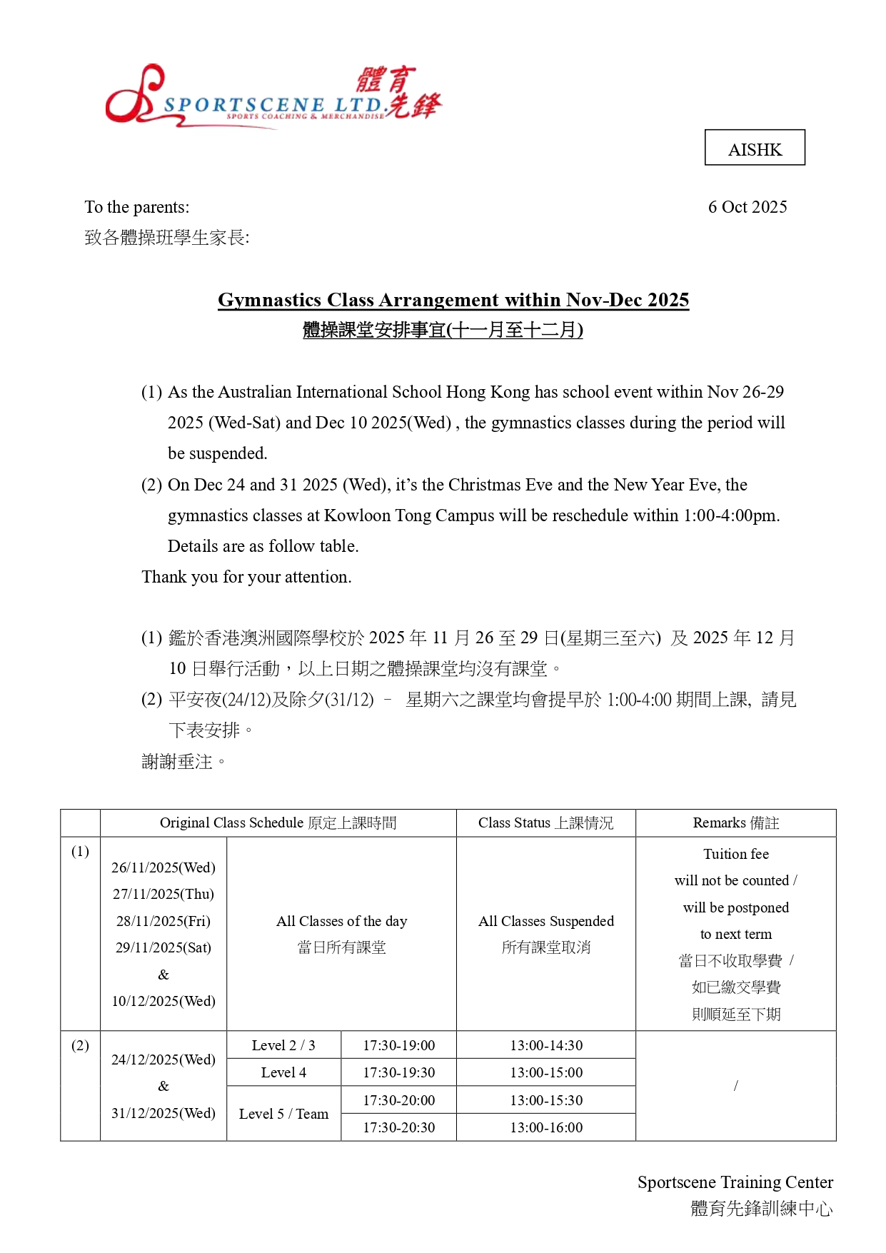 Kowloon Tong Campus (Nov -Dec 2025) Classes Arrangment